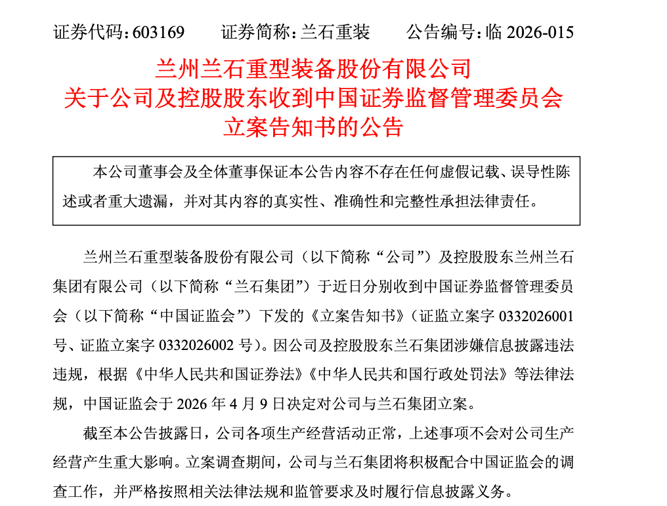 因兰石重装及控股股东兰石集团涉嫌信息披露违法违规,根据《中华人民共和国证券法》《中华人民共和国行政处罚法》等法律法规,中国证监会于2026年4月9日决定对公司与兰石集团立案。