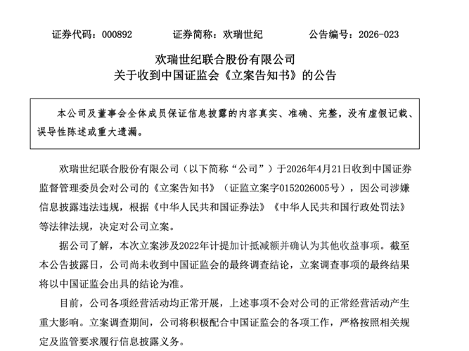 欢瑞世纪发布的公告显示,公司于2026年4月21日收到中国证监会出具的《立案告知书》,因公司涉嫌信息披露违法违规,根据《中华人民共和国证券法》《中华人民共和国行政处罚法》等法律法规,中国证监会决定对公司立案。