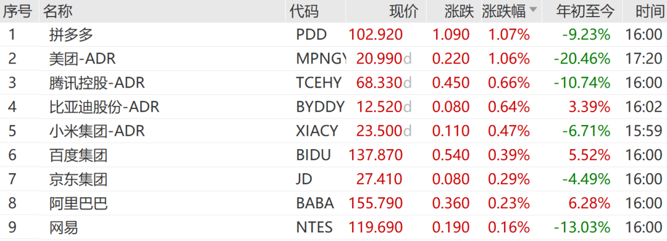 万得中概科技龙头指数成份股全线上涨,拼多多涨1.07%,美团涨1.06%,腾讯控股涨0.66%,领涨该指数成份股。