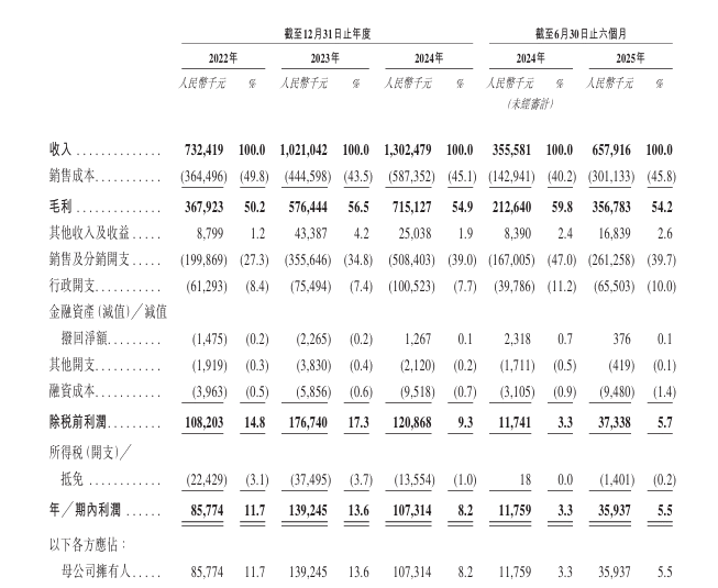 坦博尔冲击港股最亮眼的标签是其营收高速增长。2022年至2024年,坦博尔营收从7.32亿元稳步升至13.02亿元,2025年上半年,营收达6.58亿元,同比增长85%。
