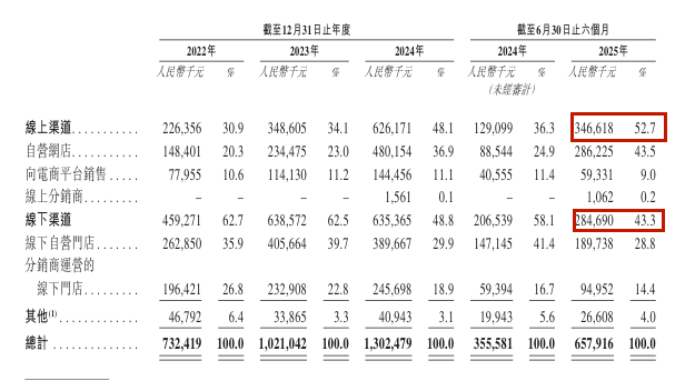 从招股书可以看出,坦博尔近年来积极进行渠道转型,也取得了一些成效。2022年至2024年,其线上渠道收入从2.26亿元增至6.26亿元,占比从30.9%提升至48.1%。2025年上半年的线上收入占比首次超过线下。