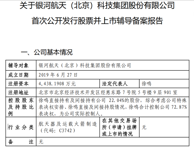 辅导备案报告显示,银河航天成立于2019年6月27日,注册资本达4438.19万元,法定代表人为徐鸣。