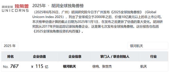 官网显示,银河航天是一家卫星互联网解决方案提供商和卫星制造商,致力于通信载荷、核心单机、卫星平台的自主研发与低成本量产。此前,银河航天以115亿元的估值入选胡润研究院发布的《2025全球独角兽榜》。