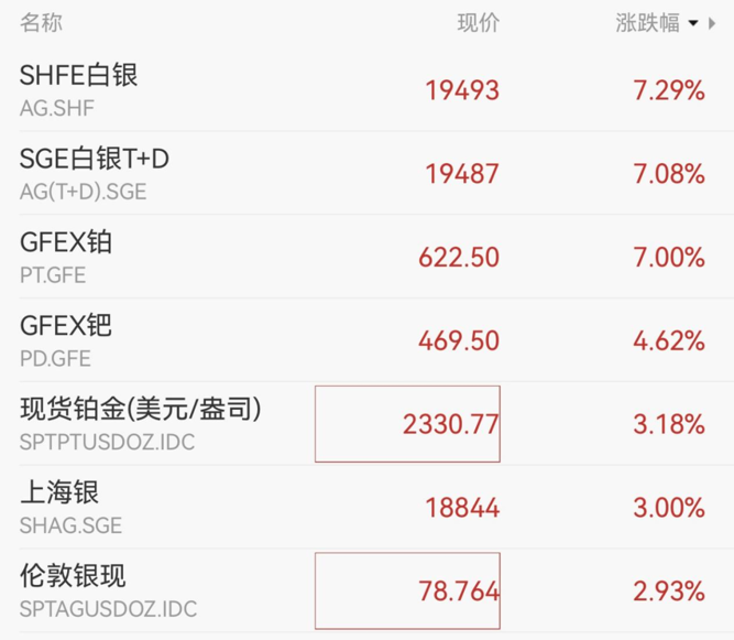 消息面上,国内贵金属期货持续拉升,沪银、铂主力合约日内涨超7%。此外,今日国内黄金饰品价格对比显示,多家黄金珠宝品牌公布的境内足金首饰价格延续近期涨势,其中周大福、周大生等足金首饰报1390元/克,较昨日上涨12元/克。
