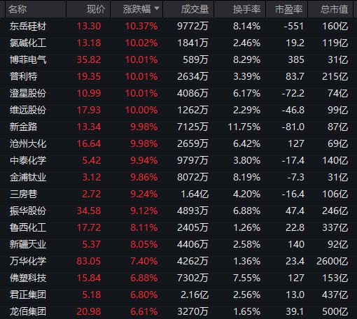 化工板块震荡拉升,盐化工方向领涨,氯碱化工、博菲电气、普利特等多股涨停。