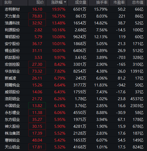 志特新材20%涨停,利源股份、常铝股份、安宁股份等多股涨停。