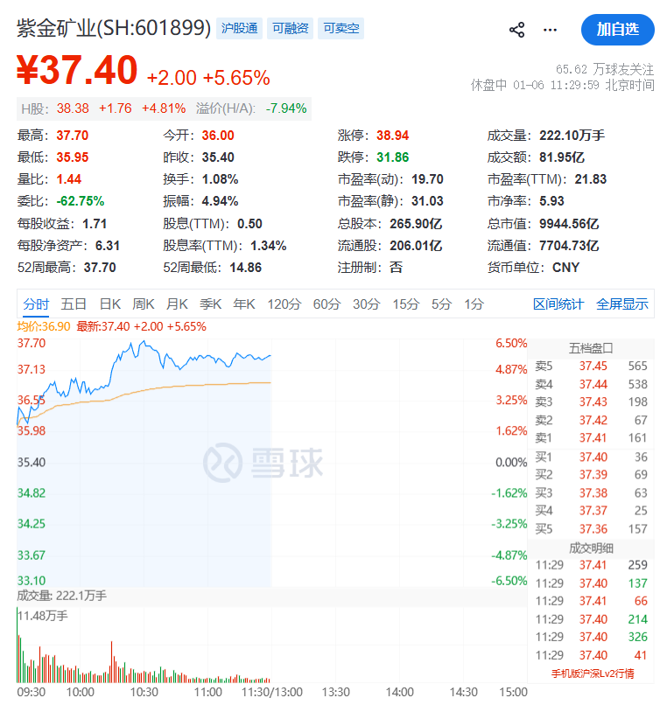 有色板块再度走强,铜、铝等工业金属方向领涨,紫金矿业盘中涨逾6%,股价创历史新高,总市值一度突破万亿元。