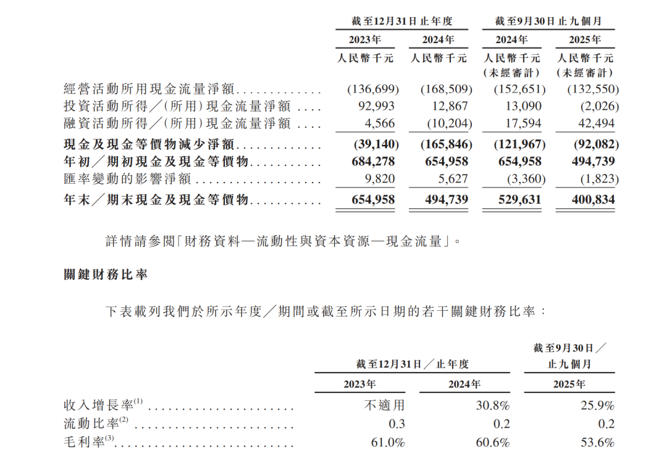 再惠的经营性现金流持续净流出。2023年至2025年前三季度分别为-1.37亿元、-1.96亿元、-1.33亿元,显示公司持续处于“失血”状态。截至2025年9月30日,公司持有的现金及现金等价物仅为4亿元,而流动资产与流动负债的缺口持续扩大,流动比率仅为0.2,流动性风险日益凸显。