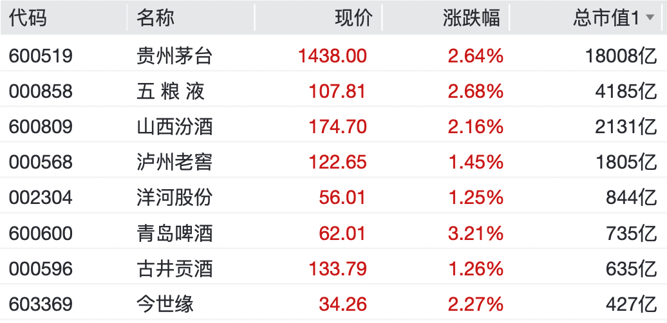 五粮液涨2.68%,山西汾酒、青岛啤酒均涨超2%。皇台酒业涨停,水井坊涨超7%,金徽酒涨超6%,重庆啤酒、金种子酒、酒鬼酒等纷纷上涨。