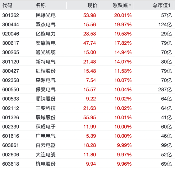 个股掀“涨停潮”!民爆光电、双杰电气录得20cm涨停,森源电气、保变电气、顺钠股份、三变科技、联域股份、广电电气、白云电器、大连电瓷、汉缆股份等均录得10cm涨停。其中多只个股一字涨停。