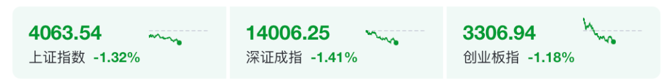 截至午间收盘,沪指报4063.54点,跌1.32%;深证成指走弱,跌1.41%;创业板指跌1.18%。