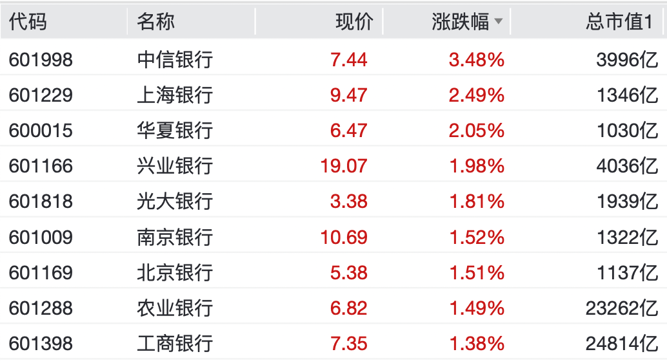 中信银行涨超3%,上海银行、华夏银行等涨超2%,工商银行、农业银行、建设银行、中国银行、兴业银行、光大银行等涨超1%。