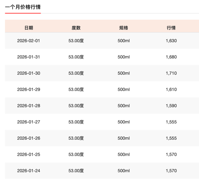 1月28日至30日,飞天茅台批发价格连续三日上扬。1月30日,根据某第三方平台信息,2026年飞天(原装)最新价格为1710元/瓶,较前一日上涨100元。2月1日价格有所回落,为1630元/瓶。