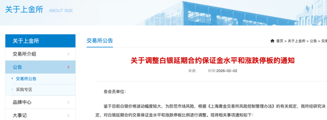 鉴于目前白银价格波动幅度较大,为防范市场风险,根据《上海黄金交易所风险控制管理办法》的有关规定,上金所经研究决定,对白银延期合约交易保证金水平和涨跌停板比例进行调整。若2026年2月2日(星期一)Ag(T+D)合约出现单边市情况,则自收盘清算时起,该合约的保证金水平从20%调整为26%,下一交易日起涨跌幅度限制从19%调整为25%。若未出现单边市情况,则Ag(T+D)合约保证金水平和涨跌幅度限制维持不变。