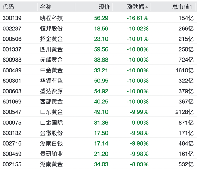 多只个股再次跌停。招金黄金、四川黄金、赤峰黄金、中金黄金、华锡有色、西部黄金、山东黄金、山金国际、金徽股份、湖南白银、贵研铂业均录得10cm跌停。晓程科技跌超16%。