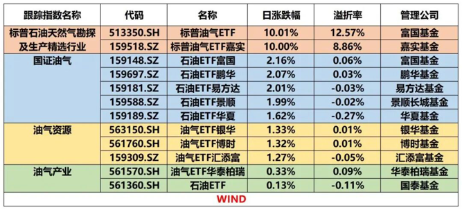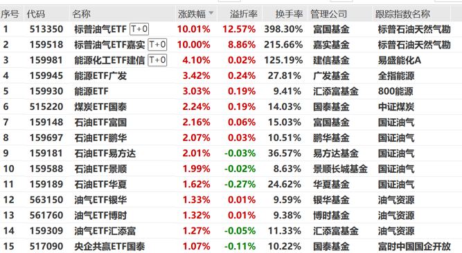 ETF涨幅方面,多只油气ETF涨停,有的产品溢价率已经超12%。