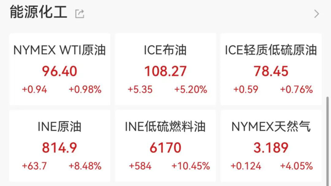 与此同时,国际油价还在持续走高。截至发稿,ICE布油涨超5%,报108.27美元/桶。