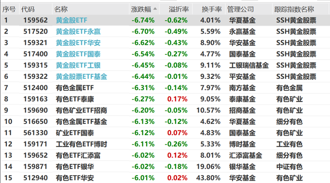 ETF下跌方面,多只黄金、有色金属相关ETF跌超6%。