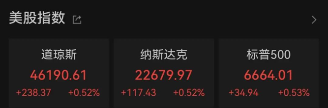 截至收盘,道指涨238.37点,涨幅为0.52%,报46190.61点;纳指涨117.43点,涨幅为0.52%,报22679.97点;标普500指数涨34.94点,涨幅为0.53%,报6664.01点。