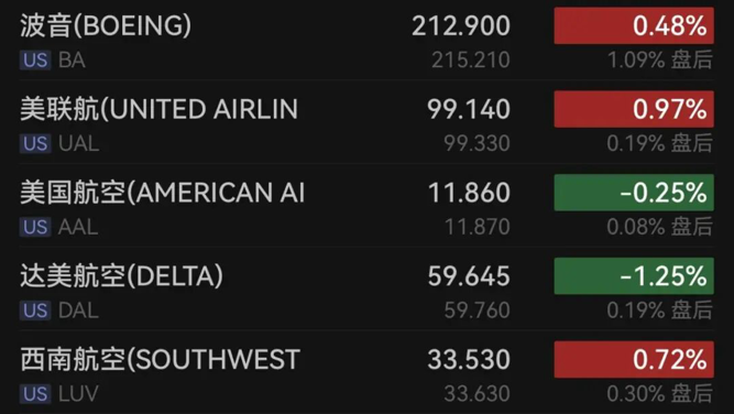 航空股涨跌不一,波音涨0.48%,美国航空跌0.25%,达美航空跌超1%,西南航空涨0.72%,美联航涨近1%。