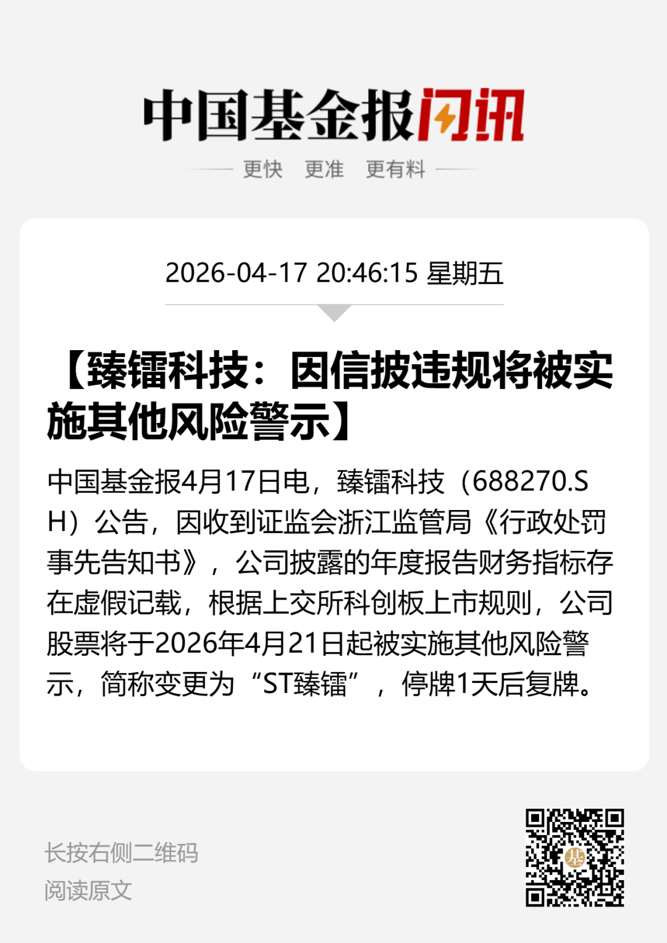 因信息披露违法违规,根据《科创板股票上市规则》相关条款,臻镭科技股票将在4月20日停牌一天,4月21日起复牌并被实施其他风险警示(ST)。同时,公司证券简称由“臻镭科技”变更为“ST臻镭”。