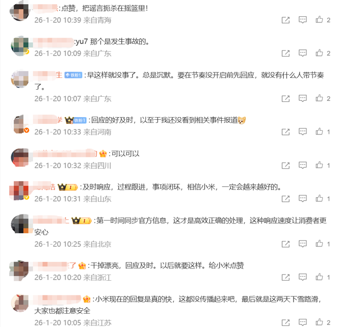 对于小米公司发言人的回应,网友表示“回应得好及时,以至于我还没看到相关事件报道”,“把谣言扼杀在摇篮里”。