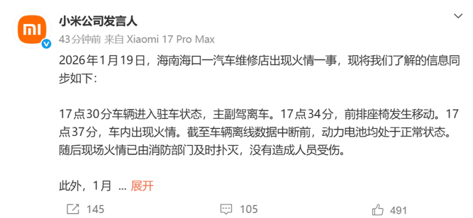 1月20日,小米公司发言人在微博发表声明,就1月19日发生的两起相关事件作出回应。这两起事件分别为海南海口一汽车维修店车辆火情和河南兰南高速小米YU7交通事故。