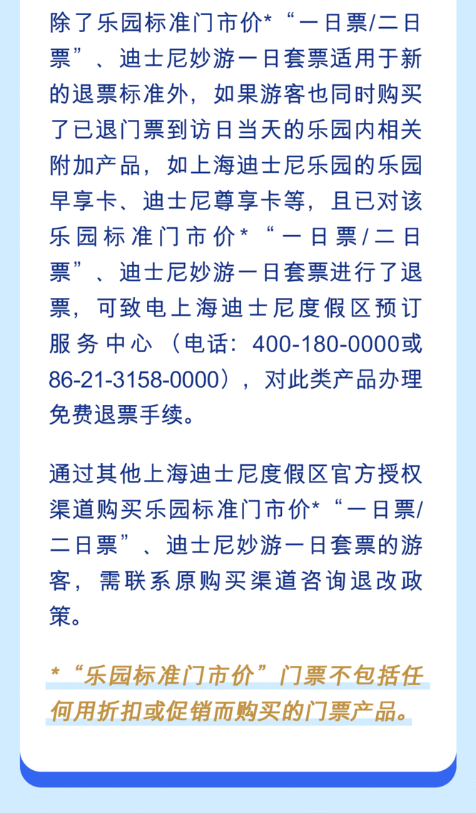 此外,通过其他上海迪士尼度假区官方授权渠道购买乐园标准门市价“一日票/二日票”、迪士尼妙游一日套票的游客,需联系原购买渠道咨询退改政策。