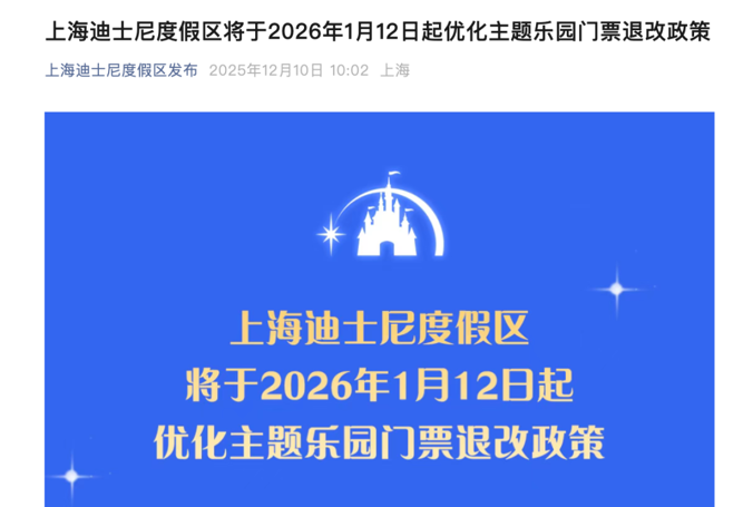 12月10日上午,上海迪士尼度假区宣布,将于2026年1月12日起优化上海迪士尼乐园门票退改政策,旨在为游客提供更多便利,帮助游客更好地应对不可预见因素对行程和游园计划可能造成的影响。