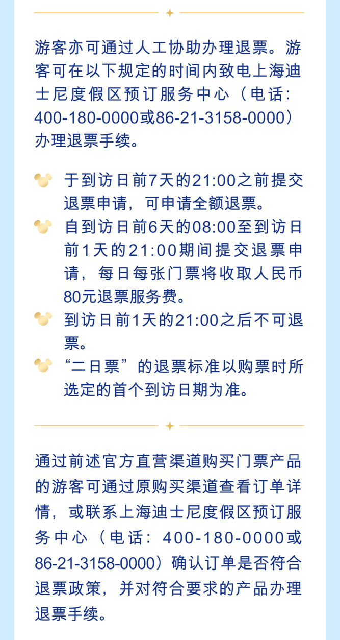 具体来看,于到访日前7天的23:59(含)之前提交退票申请,可申请全额退票。自到访日前6天的00:00至到访日前1天的23:59(含)期间提交退票申请,每日每张门票将收取人民币80元退票服务费。到访日当日00:00之后不可退票。“二日票”的退票标准以购票时所选定的首个到访日期为准。