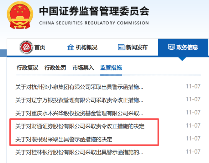11月7日,证监会官网显示,浙江证监局对财通证券采取责令改正的措施,对财通证券高管裴根财采取出具警示函的措施。