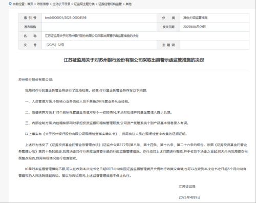 4月11日,江苏证监局发布公告称,因苏州银行基金托管业务存在多项违规,对该行采取出具警示函的监管措施。