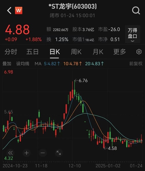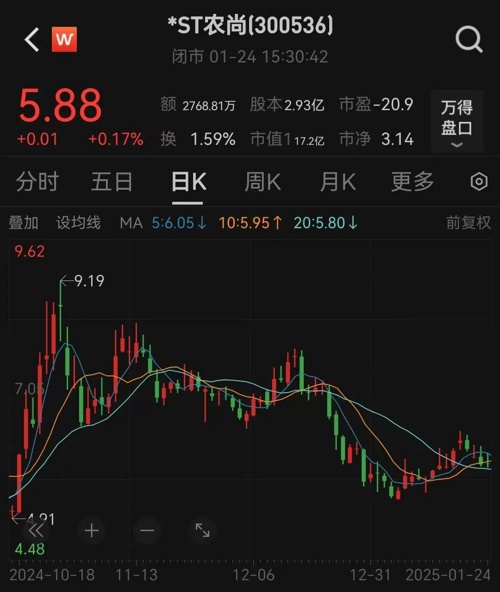 1月24日,*ST龙宇股价以4.88元/股报收,最新市值为18.4亿元;*ST农尚股价以5.88元/股报收,最新市值为17.2亿元。