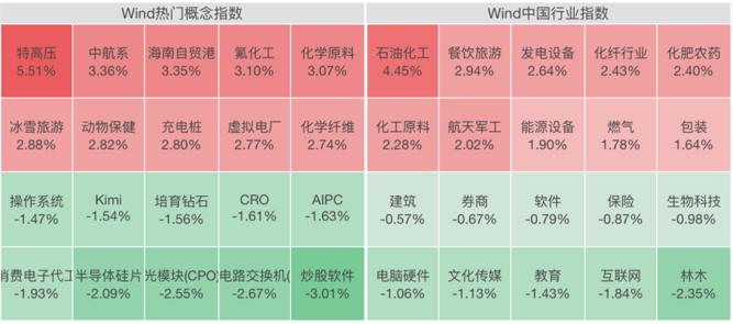 从板块看,电网设备、旅游酒店、商业航天、人形机器人、化工板块涨幅居前;保险、通信设备、文化传媒等板块下挫。