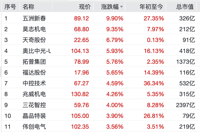 个股方面,三花智控涨4%,拓普集团涨近6%。昊志机电、五洲新春、天奇股份等涨幅居前。
