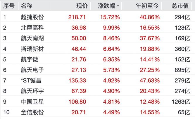 个股方面,超捷股份涨超15%,北摩高科、九鼎新材涨停,中国卫星、斯瑞新材等涨幅居前。