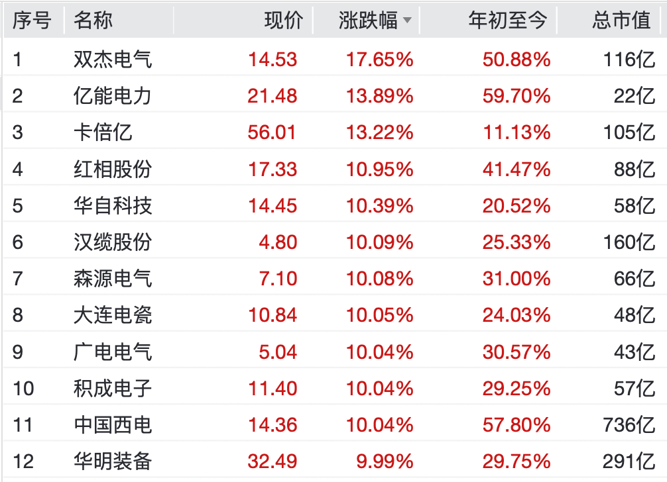 个股方面,汉缆股份、森源电气双双录得两连板,双杰电气大涨17.65%,大连电瓷、广电电气、积成电子等纷纷涨停。