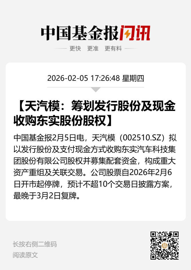与2025年4月份披露的交易方案相比,2026年2月5日晚披露的交易方案有了较大变动,特别是在交易方式上,由现金收购变成了“发行股份+支付现金”的组合方式。此外,2026年2月5日晚发布的公告中,天汽模也未透露拟收购东实股份具体多少股份。