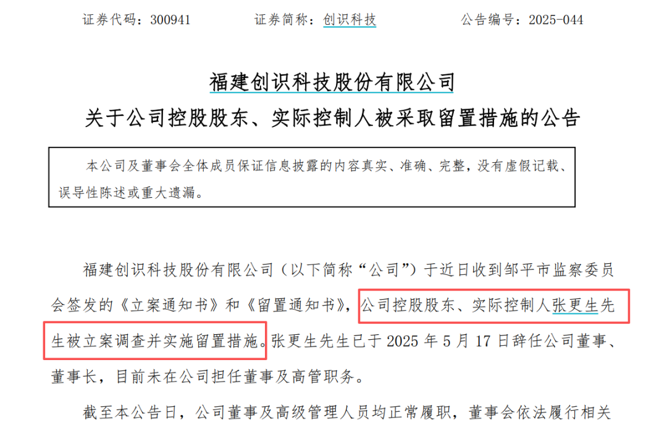12月22日,创识科技发布公告称,公司近日收到邹平市监察委员会签发的《立案通知书》和《留置通知书》,公司控股股东、实际控制人张更生被立案调查并实施留置措施。