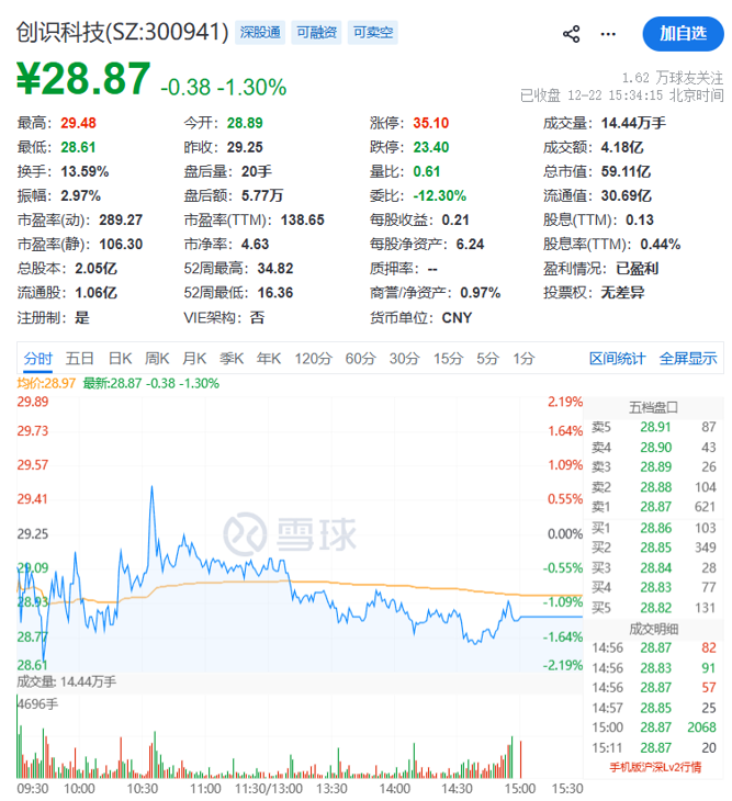 截至12月22日,创识科技股价报28.87元/股,总市值为59.11亿元。