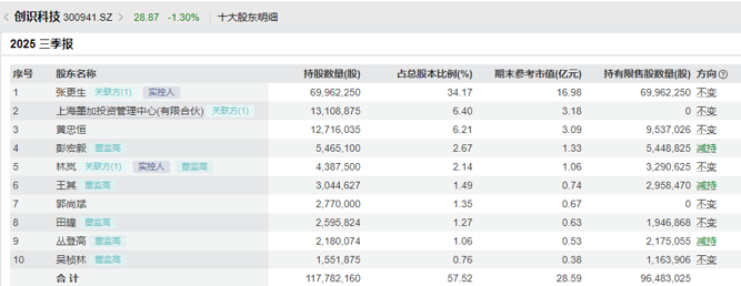 截至第三季度末,张更生持股数量为6996.23万股,持股占比为34.17%,为创识科技第一大股东。2024年,张更生年薪为87.31万元。