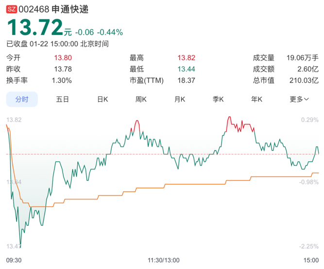 截至1月22日收盘,申通快递每股报13.72元,下跌0.44%,总市值约210亿元。