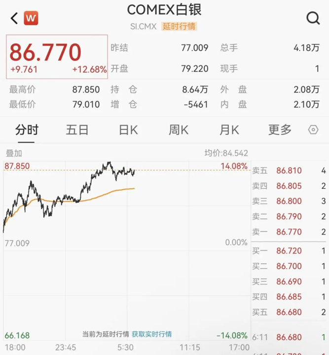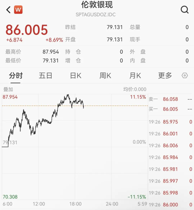 2月3日,现货白银大幅走高,一度涨超11%,现报86美元/盎司。