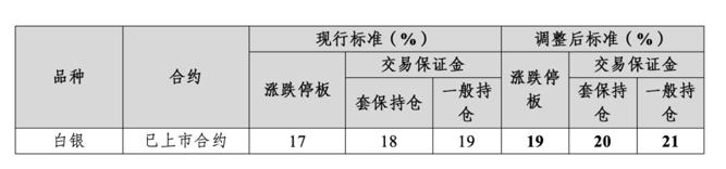 白银期货已上市合约的涨跌停板幅度调整为19%,套保持仓交易保证金比例调整为20%,一般持仓交易保证金比例调整为21%。