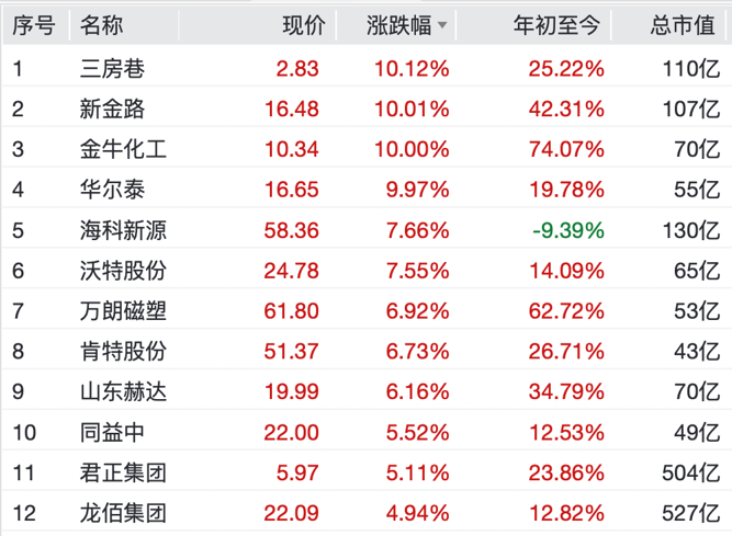 三房巷、新金路、金牛化工纷纷涨停,万华化学涨超4%,海科新源、沃特股份、肯特股份等涨超6%,荣盛石化、东方盛虹、卫星化学、万朗磁塑、山东赫达、同益中等纷纷上涨。