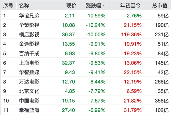 横店影视、金逸影视跌停,华谊兄弟、华策影视跌超10%,上海电影、万达电影、中国电影跌超7%。
