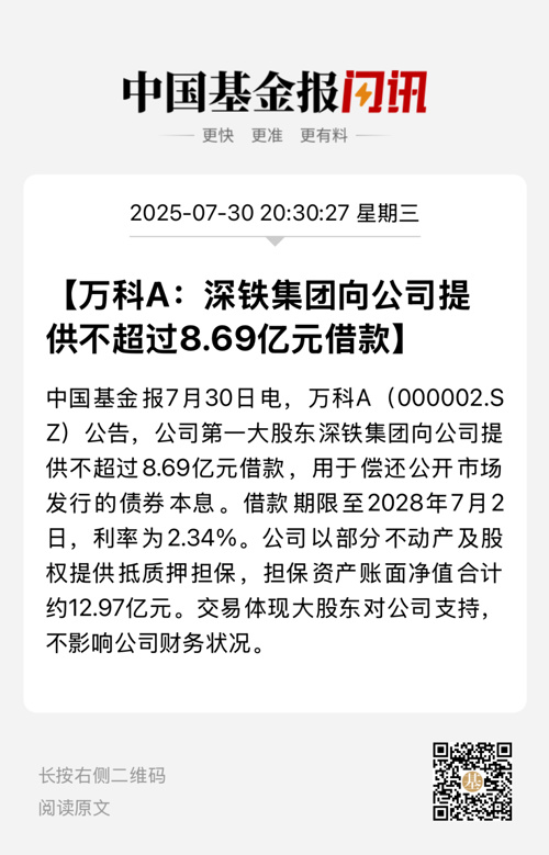 7月30日晚,万科A公告称,经协商,公司第一大股东深圳市地铁集团有限公司(以下简称深铁集团)向公司再提供不超过8.69亿元借款。借款用于偿还万科在公开市场发行的债券本息以及经出借人同意的指定借款利息。