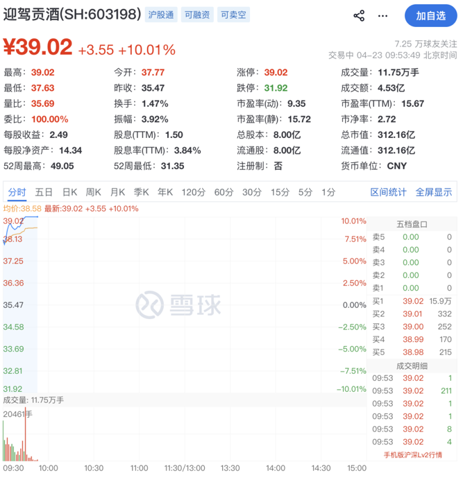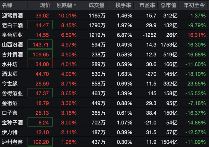 早盘白酒板块震荡反弹,迎驾贡酒率先涨停,老白干酒、山西汾酒、古井贡酒等跟涨。