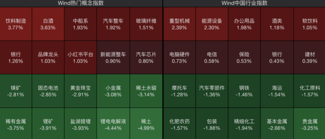 从板块看,白酒、能源设备、大金融板块表现活跃,而贵金属、稀土、化工等板块跌幅居前。