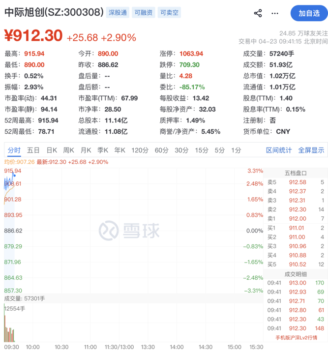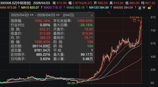 自2025年4月22日以来,中际旭创累计上涨超1000%。